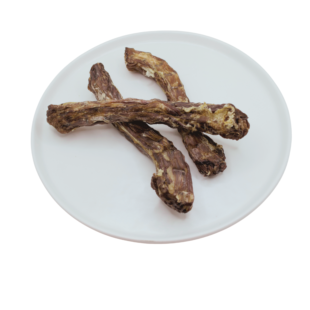 Dehydrated Duck Neck; 5 oz yields approximately 3-5 duck necks, depending on their size. Natural variations in size can occur due to the humane farming practices of the ducks